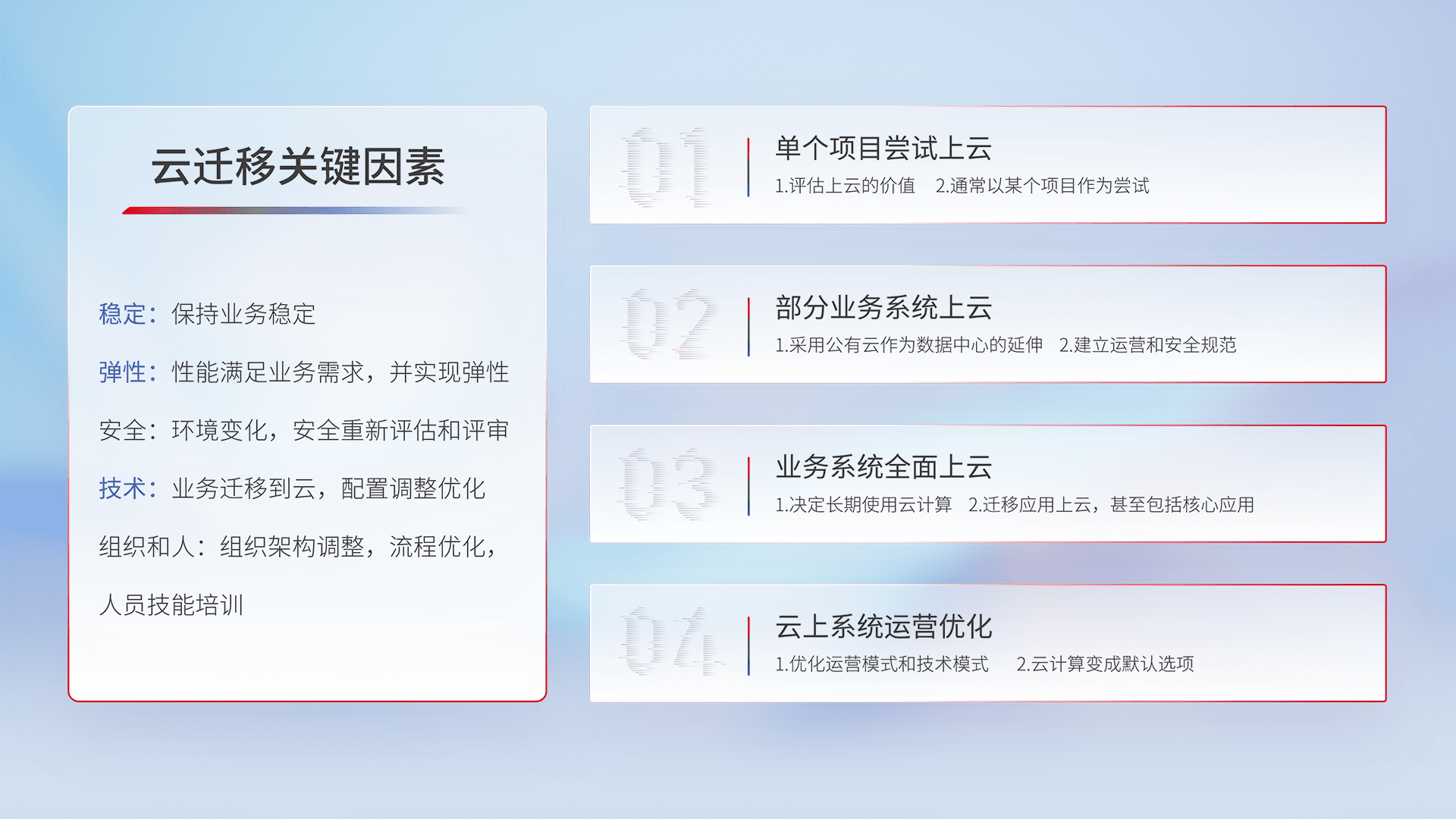 结合实际业务,,,从规划设计、、云平台选型、、云原生改造、、、数据迁移、、、、集成交付,,迁移全过程为客户识别最佳上云路径,,,,做好风险识别管理,,,,设计网络架构、、、、身份权限、、、安全审计合规、、、、操作审计、、日志审计、、监控告警策略、、、、多站点容灾设计等,,,,对云上基础设施进行整体规划,,提升IT治理水平,,,,以满足弹性、、、高可用、、、高性能的需求。。